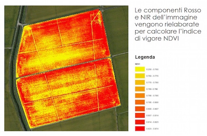 NDVI è un indice multispettrale che indica il contenuto di clorofilla nelle piante e viene definito come: